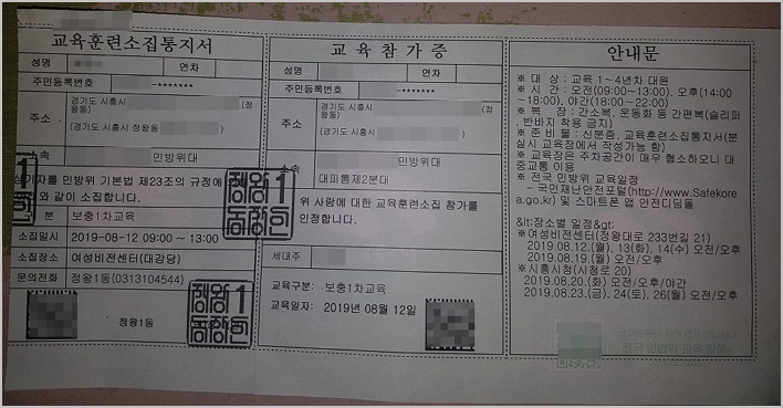 다행히도 통지서에 자세한 내용이 적혀있어서 어렵지 않게 훈련을 무사히 마치고 왔습니다.